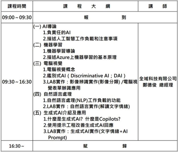 為培育更多製造業AI應用人才,以推動製造業的AI轉型,CHC與Microsoft、全域科技合作規劃舉辦AI基礎1日班,鼓勵正在尋求如何利用AI技術提高工作效率、降低成本,並創造更多的業務價值或解決方案之企業免費參加,增強產業AI概念與實務應用。